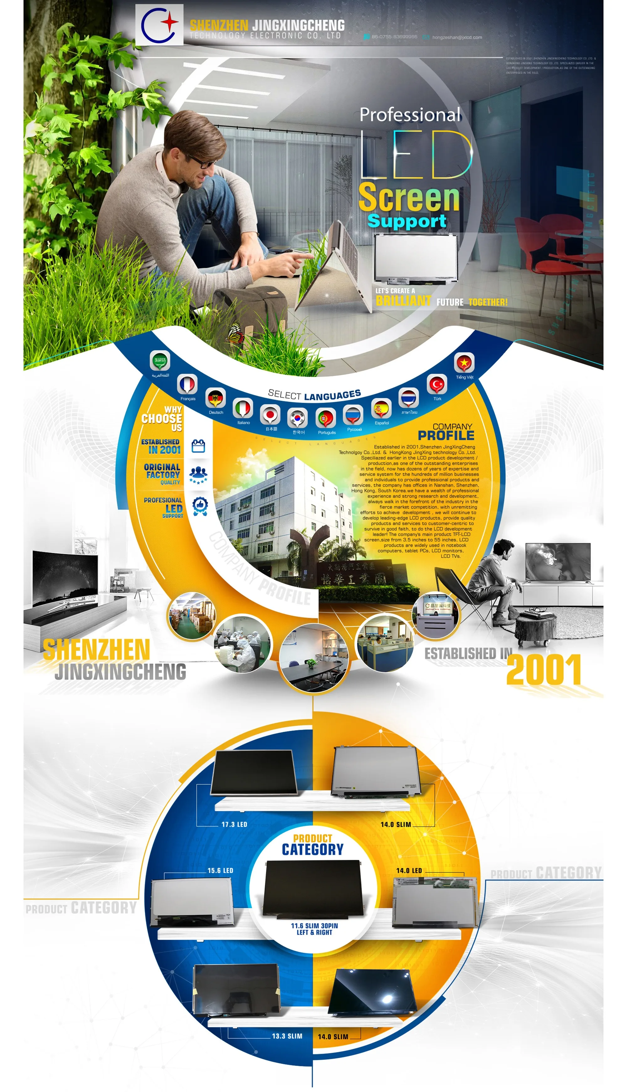 Established in 2001, Shenzhen Jingxingchengchnolgoy Co, Ltd. & Hongkong Jingxing technology Co. Ltd. As one of the outstanding enterprises in the field, it has decades of professional knowledge and service system, providing professional products and services for hundreds of millions of enterprises and individuals. Company's main products TFT-LLscreen, Size from 13.3/14.0 (10.1/11.1/11.6/12.5 / / 14.5/15.4/15.6/16.1/23.8/17.3/21.5 inch) LCD products are widely used in notebook computers, notebook computers, LCD monitor, LCD TV, etc. Main screen brands: BOE/Innolux /LG/ Samsung/AU. Our products are sold in more than 60 countries worldwide